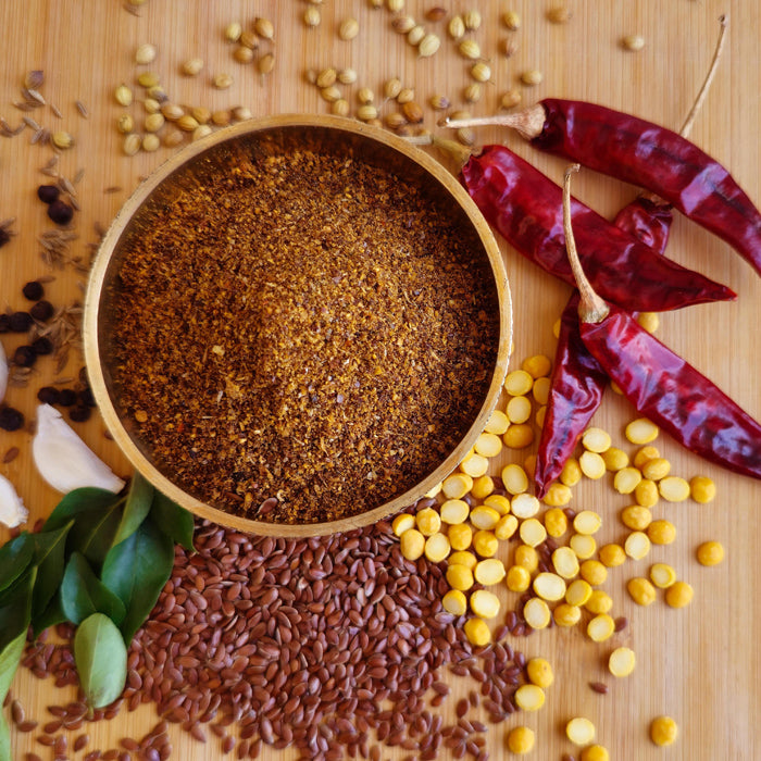 Our Flax Seed Podi is the perfect addition to your pantry for a healthy boost. Made with a signature spice blend, this Podi is rich in fiber and omega-3 fatty acids, and packed with lignans that promote heart health, aid digestion, and may even reduce the risk of certain cancers.